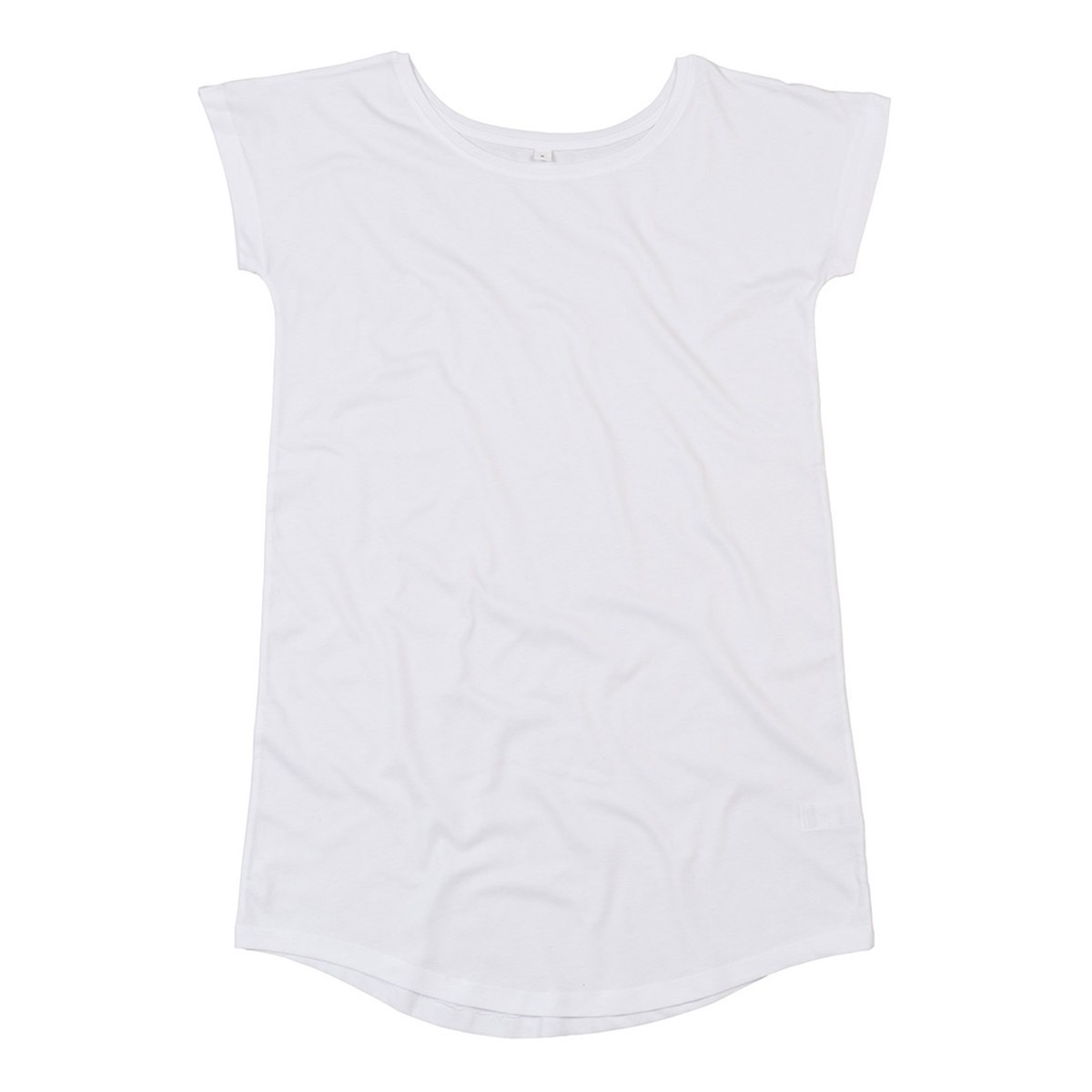 100% cotone organico single jersey. Vestito manica corta, leggermente sfiancato, taglio extralungo, orlo arrotondato, girocollo profondo, etichetta strappabile, struttura con cuciture laterali.
