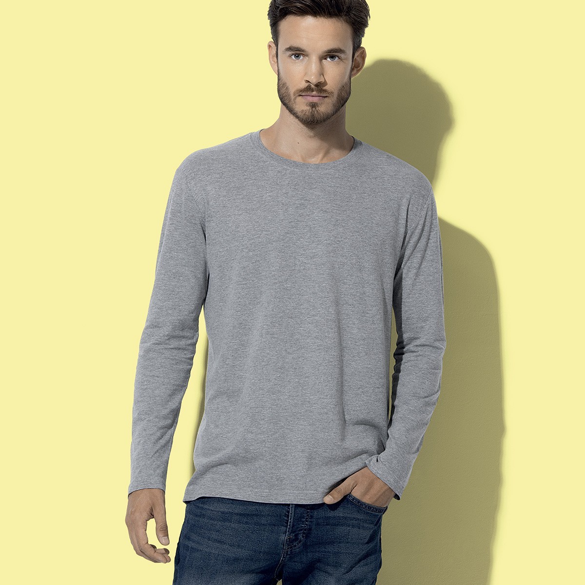 100% cotone ring-spun, single jersey. T-shirt manica lunga set-in, girocollo, struttura con busto tubolare, cucitura a doppio ago su collo, maniche e vita, nastro di rinforzo alle spalle, maniche senza polsini. GYH: 85% cot. 15% vis.