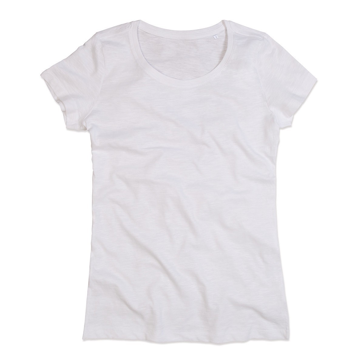 100% cotone single jersey. T-shirt manica corta, set-in, girocollo profondo, tessuto slub, struttura con cuciture latera