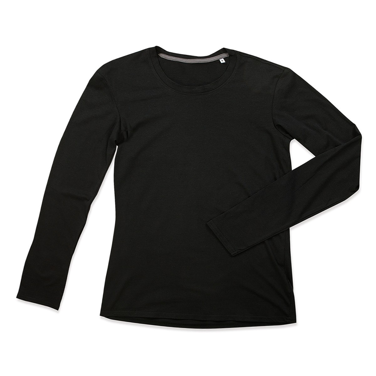 95% cotone ring-spun, 5% elastane single jersey. T-shirt manica lunga set-in, girocollo stretto in costina con fettuccia