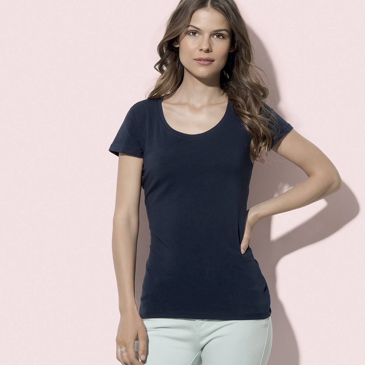 95% cotone ring-spun pettinato single jersey, 5% elastane. T-shirt manica corta, girocollo profondo in costina sottile,