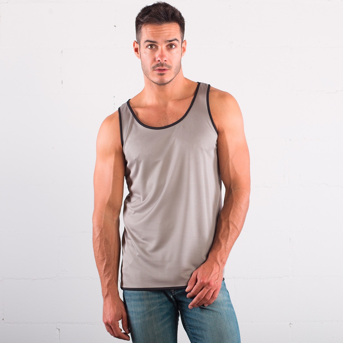 100% poliestere. Canotta sportiva, profondo girocollo, regolazione dell'umidità, asciugatura rapida, orlo su collo, giro
