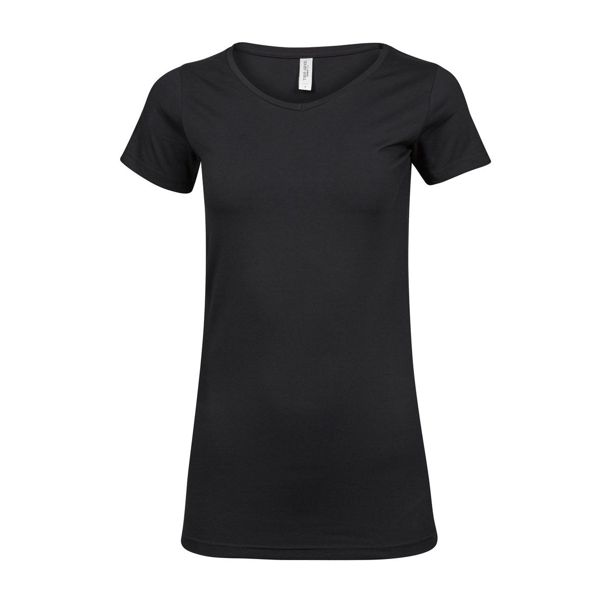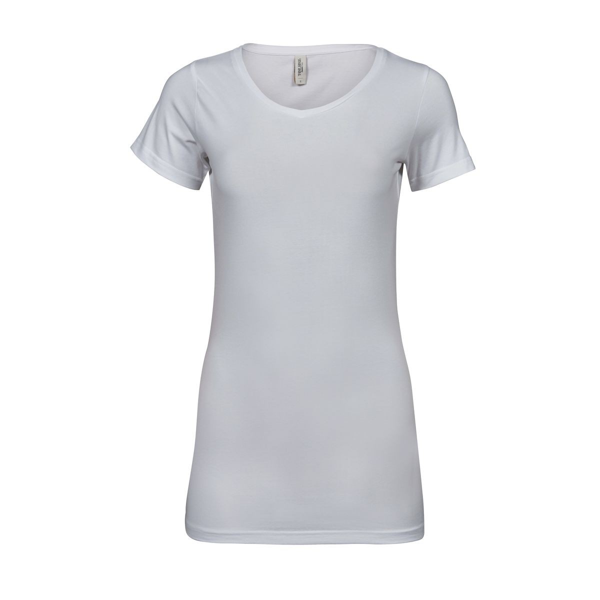 90% cotone ring-spun, 10% elastane. T-shirt extra lunga, scollo a V con costina sottile in lycra, Morbida al tatto e leg