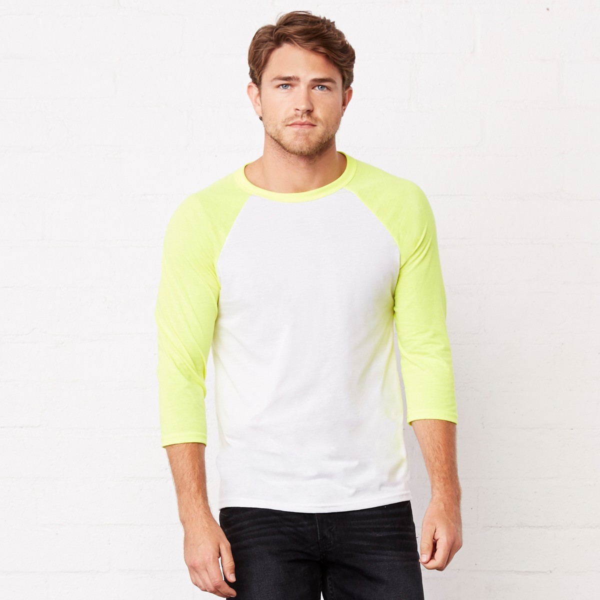 52% cotone pettinato ring-spun, 48% poliestere. T-shirt baseball manica 3/4 raglan, girocollo di colore contrastante. Vestibilità moderna, struttura con cuciture laterali. Colori Triblend: 50% pol. 25% cot. 25% rayon. Colori Marble: 91% pol. 9% cot. Black Heather: 90% cot. 10% pol. Colori Neon: 52% cot. 48% pol. (Colori Triblend: 115 g/m²).