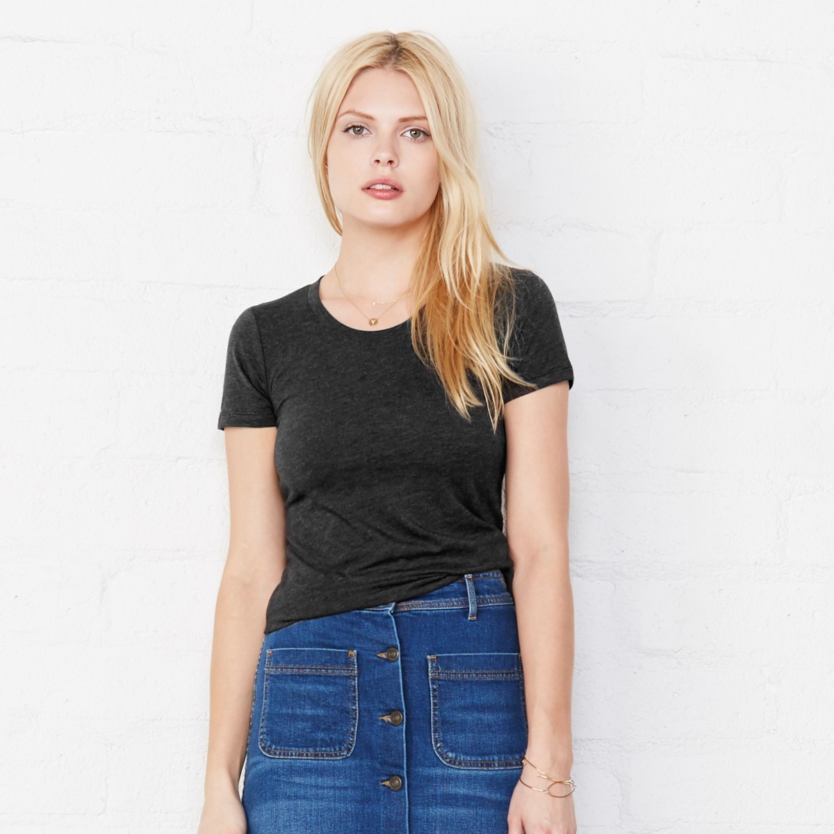 50% poliestere, 25% cotone ring-spun, 25% rayon. T-shirt manica corta set-in, girocollo profondo, struttura con cuciture laterali, vestibilità moderna, leggermente sfiancata. Black Heather Triblend: 70% cot. 15% pol. 15% rayon.
