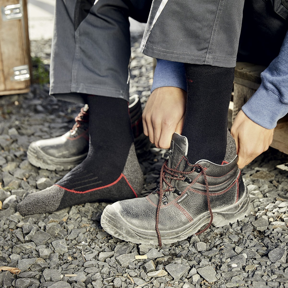 68% poliestere, 18% poliammide, 6% lana, 6% polipropilene. Calzini in tessuto caldo e termoregolatore, cuciture piatte, ampi elastici.